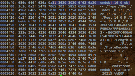 This is why we must first take a look at the xref section. We can see that the offset from the beginning of the file to the xref table is 20215 bytes, which in hexadecimal form is 0x4ef7. If we take a look at the hexadecimal representation of the file as we can get with the xxd tool, we can see what’s presented in the picture below: