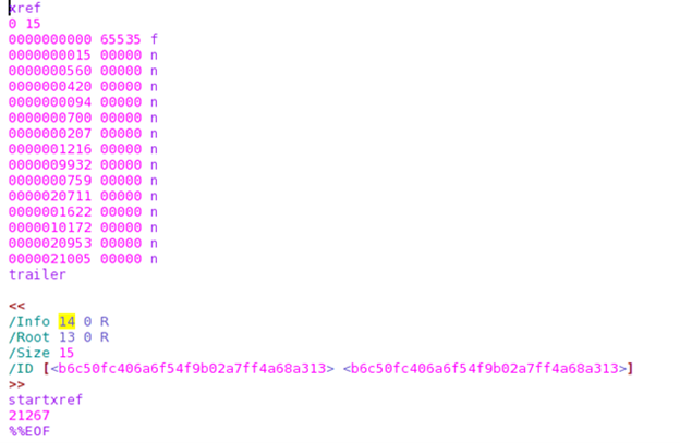 Clearly, the /Root and /Info object numbers have changed and other stuff as well, but we got the trailer and xref keywords that define the xref table. We can see that there are 14 objects in the xref table.