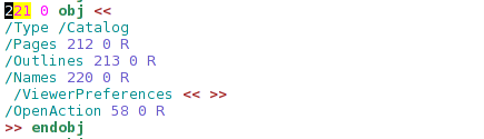 We can see that the object is indeed the Document Catalog. The Page Tree object is 212, the Outlines object is 213, the Names object is 220 and the OpenAction object is 58. We haven’t talked about any other types than the Page Tree object, so we’ll continue with the Page Tree talk only.