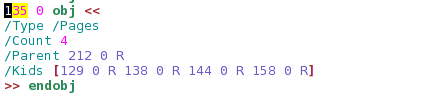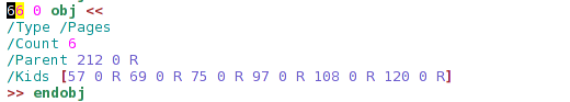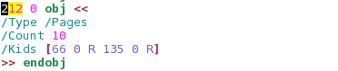 So the 212 object contains the actual pages of the PDF document. It contains 10 pages, which is exactly right (we can check this out if we open the PDF file with any PDF reader and check the number of pages).