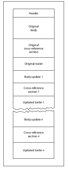 The PDF has been designed with incremental updates in mind, since we can append some objects to the end of the PDF file without rewriting the entire file. Because of this, changes to a PDF document can be saved quickly. The new structure of the PDF document can be seen in the picture below: