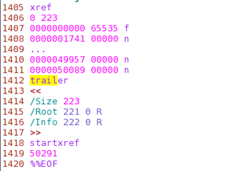 Let’s open that PDF in a text editor like gvim and check out the trailer section. We must know by now that all PDF documents should be read from the end to the start. The trailer is represented in the picture below: