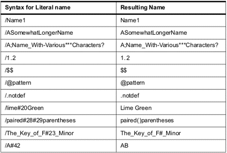 The names in PDF documents are represented by a sequence of ASCII characters in the range 0x21 – 0x7E. The exception are the characters: %, (, ), <, >, [, ], {, }, / and #, which must be preceded by a slash. An alternative representation of the characters is with their hexadecimal equivalent, preceded by the character “#”. There is a limitation of the length of the name element, which may be only 127 bytes long.