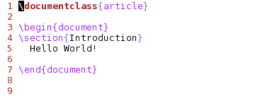We can see that the .tex document doesn’t really contain much. First, we’re defining the document to be an article and then including the contents of the article inside the begin and end document. We’re including a new section with a title (Introduction) and including the static text “Hello World!”.