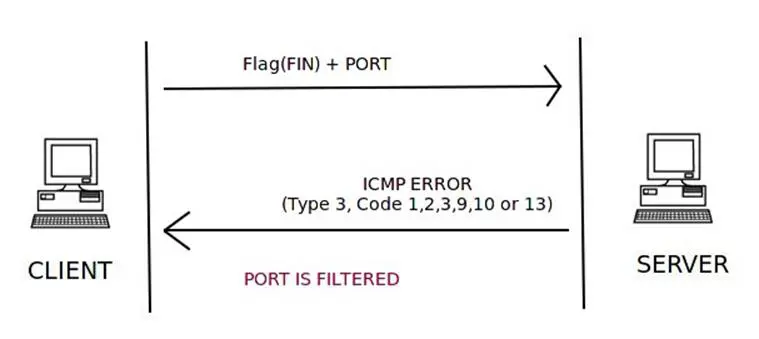 An ICMP packet with ICMP type 3 and code 1, 2, 3, 9, 10, or 13 in response to the FIN scan packet from the client means that the port is filtered and the port state cannot be found.