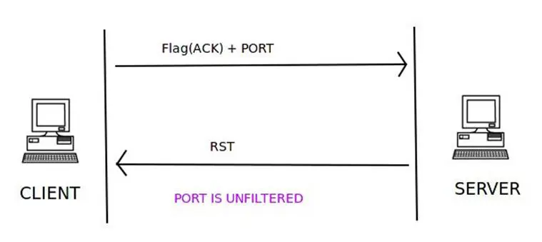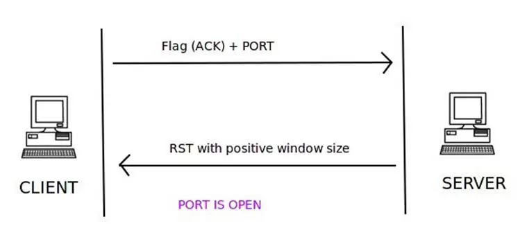 A TCP packet with the ACK flag set and the port number to connect to is sent to the server. If the server responds with the RSP flag set inside a TCP packet, then the port is unfiltered and a stateful firewall is absent.