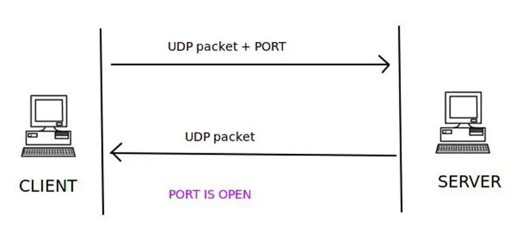 The client sends a UDP packet with the port number to connect to. If the server responds to the client with a UDP packet, then that particular port is open on the server.