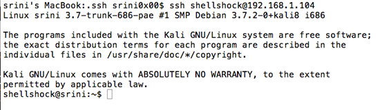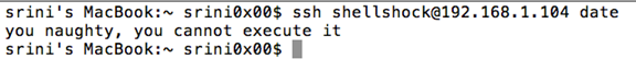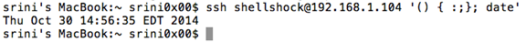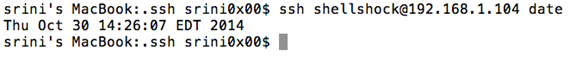 $ ssh <a href="mailto:shellshock@192.168.1.104">shellshock@192.168.1.104</a> date