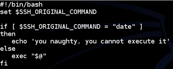 Unlike the previous case, where 'date' is blocked by script.sh specified in the authorized_keys file, this time our arbitrary command itself is becoming the first command and hence we are getting the date printed.
