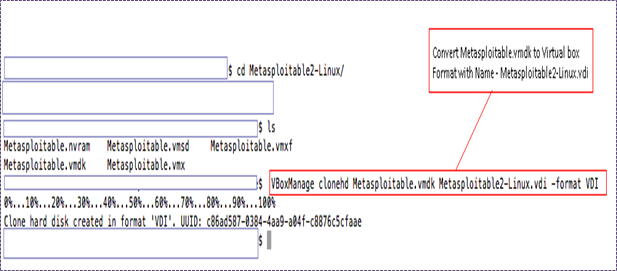 This step was not very difficult and just by doing a little bit of Googling, I was able to find out how to convert the VMware image to VirtualBox. One can use the following command for image conversion:VBoxManage clonehd Metasploitable.vmdk Metasploitable2-Linux.vdi -format VDI*.vmdk files are VMware extensions and VDI is the extension for VirtualBox. The above command will do the conversion – which can be seen in following screenshot: