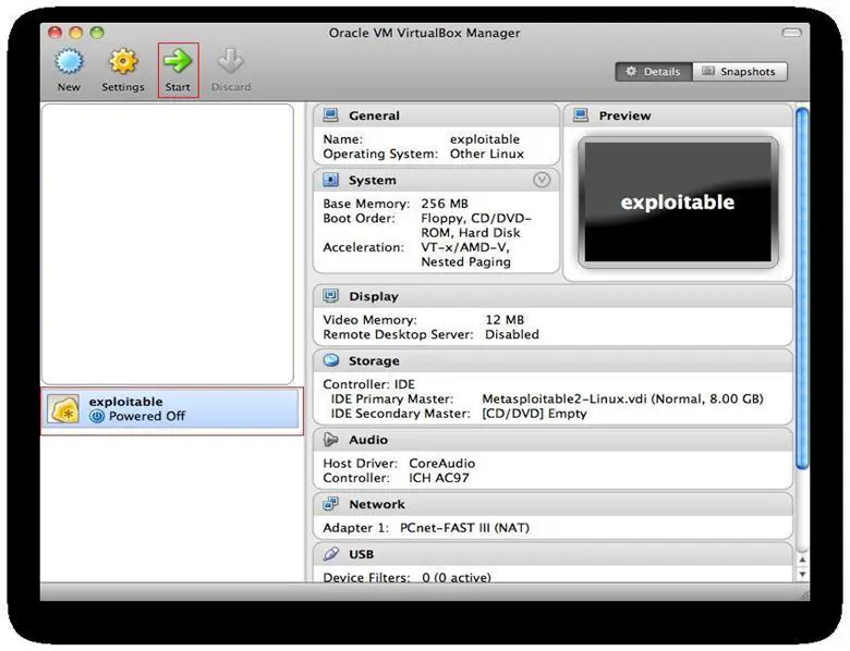 e. Next, Click on "Exploitable" Virtual Machine and click the "Start" button to start the Virtual Machine as shown in following screenshot