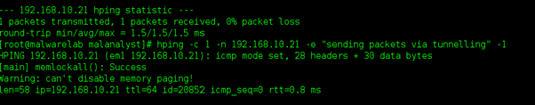 Now let's showcase this scenario by using the Hping tool. Hping is a packet crafter tool used to conduct a test or attack on a device. For a normal ping message that we send using a command prompt, it sends four packets of data. So if we want to send a particular ICMP request with a particular type or code set then we can use Hping (we can do this in cmd prompt also, but changing code and type of ICMP in cmd is not possible). Now I am going to send data, "sending packets via tunneling", via ping message, by typing the below command.