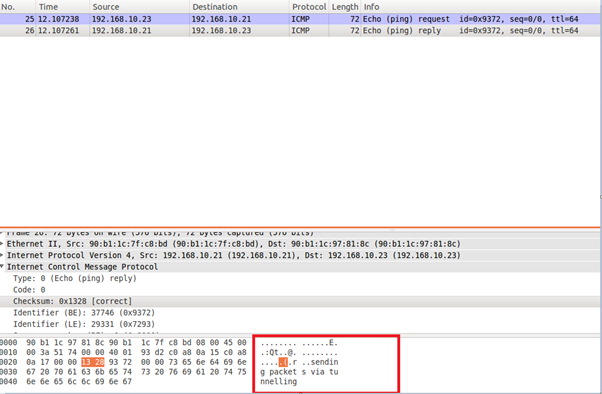 In a normal ICMP echo request, the packet length will be 42 bytes, where the data length is 0, and if we append any data into the ICMP data field then the size of the packet increases. In the above scenario, the total size is 72 bytes out of which 30 bytes is the data "sending packets via tunneling". So if we want to detect ICMP tunneling via any IDS/IPS devices we need to write a rule stating that if any data is present in the data header of the ICMP, then fire an alert.