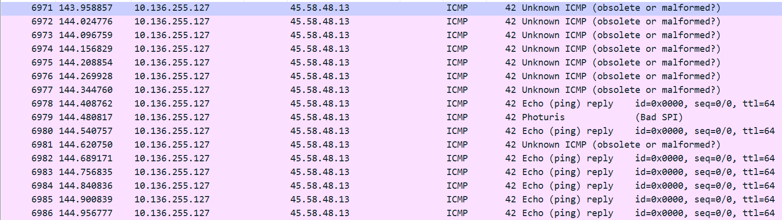 As shown above, Wireshark identifies many of the ICMP packets in the capture as obsolete or malformed. However, not all of these packets are identified as such. The reason for this is that, by chance, the data that ICMP is being abused to carry occasionally has a value that matches a valid ICMP type value.
