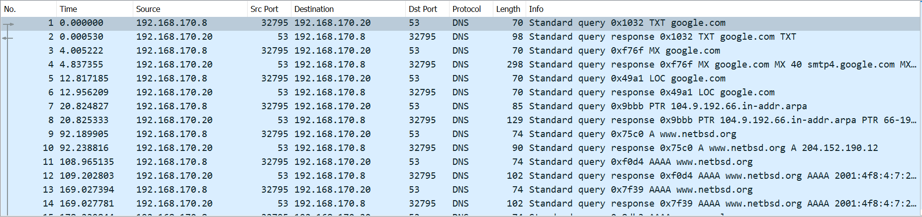 Monitoring DNS traffic in Wireshark
