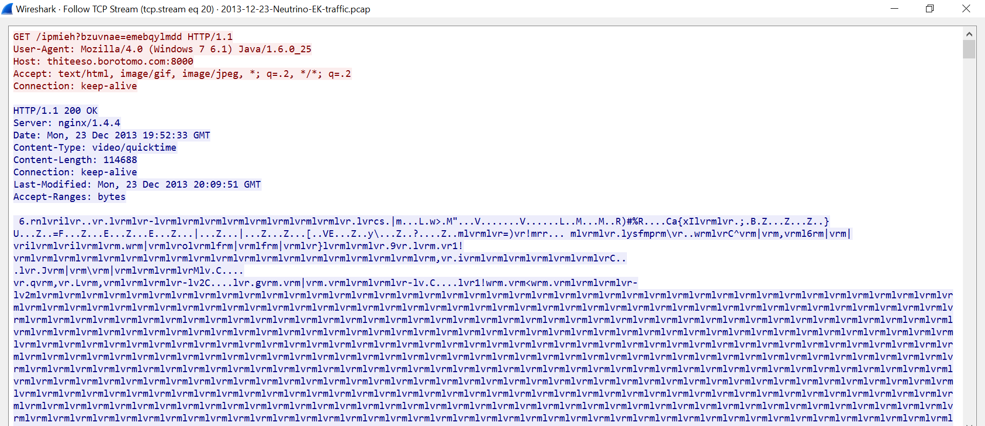 The image above is extracted from a traffic capture of a malware sample that uses XOR encryption for content obfuscation. As shown, much of the content consists of the characters “mlvr” repeated over and over.