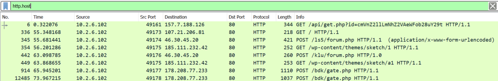 The screenshot above is from Statistics → HTTP → Requests. As shown, it lists the HTTP hosts contacted within a packet capture. This can be useful in checking if an organization’s DNS blacklist is missing any important entries based upon connections to suspicious domains.