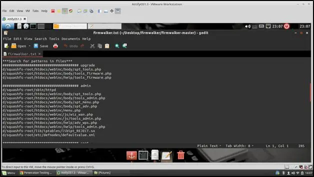 - Run Firmwalker – Once the files are extracted, we need to run Firmwalker over it. Firmwalker will scan all the files present in the firmware and look for the vulnerabilities listed above. The only prerequisite is the extracted firmware file, and Firmwalker should be present in the same folder. Once the scanning is done, Firmwalker generates the output in a file name Firmwalker.txt by default. This Firmwalker.txt file contains the list of vulnerabilities which were found in the firmware.
