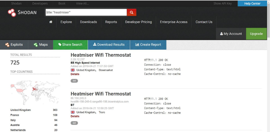 First, let's try to search using Shodan to find how much Heatmiser products are connected and accessible using the internet, and we found that there are 725 now I am writing this article.
