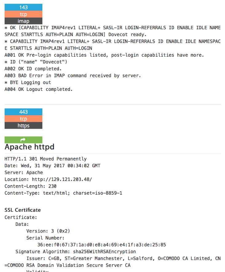 By clicking on details, we can see more information about open ports, services, content of banners, or metadata.