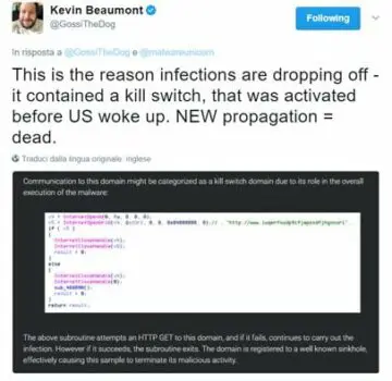 A few hours after the massive attacks security experts started their analysis of the malicious code after a reverse engineering of the samples of the malware available in the wild. The good news emerged from the first investigation is that malware researchers have discovered a kill switch in the ransomware code, a condition that could halt the execution of the code when matched.