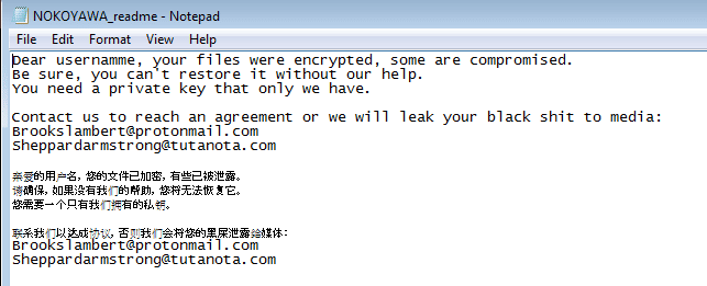 Each encrypted file has appended the .NOKOYAWA extension. The ransomware note called “NOKOYAWA_readme.txt” is also dropped into each folder with an English and Chinese version in the same file.