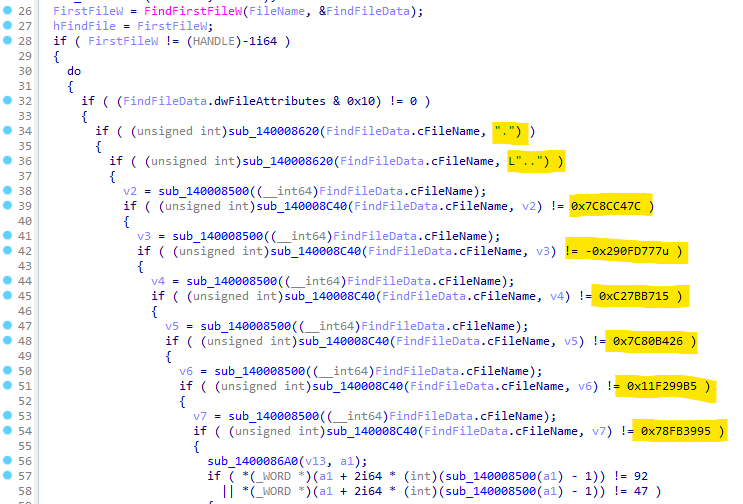 This ransomware takes advantage of multi-threading to encrypt files efficiently and quickly. Some files and extensions are skipped during the malware runtime. The folders are hashed (see list below), but the ignored file extensions are in clean-text: dll, exe and lnk.