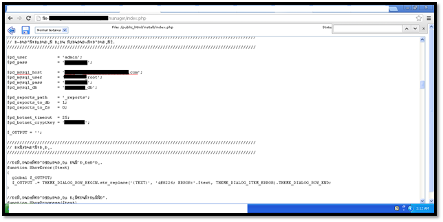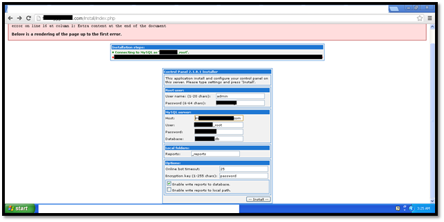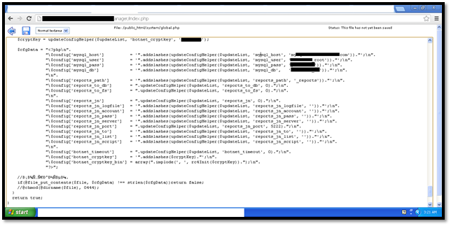 So we start by setting up an account on a web hosting and creating a Mysql database, username and password. Then we move on to the index.php file under the path /install/index.php. We make the minor changes in the code to provide information such as the username and password for Zeus, mysql host, username and password, and a botnet crypt key. Here is a screenshot showing the same: