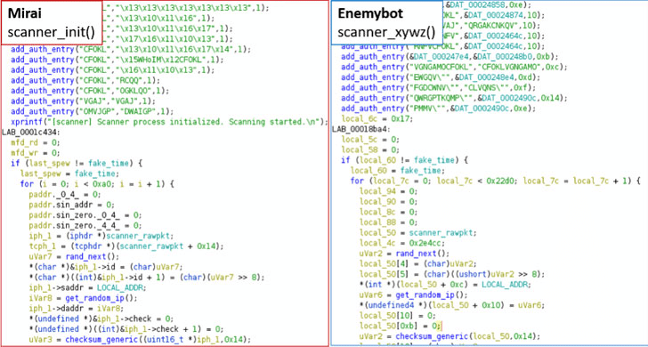 EnemyBot is malware created by combining and modifying the source code of Miray and Gafgyt. By analyzing both threats' “scanning” features, you can see that the code similarities are obvious.