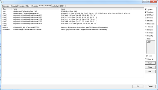 The Internet Explorer process is most probably created in order to bypass the firewall. So we can strongly suspect that the backdoor's code is injected into that process. Let's now run GMER, a popular rootkit detector, on our system. GMER is pretty advanced and implements a variety of techniques that are able to spot many common rootkits, let's see what happens: