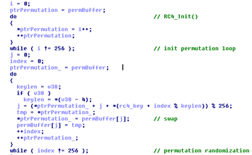This loop is particularly interesting for several reasons: first of all there's a big buffer that is continuously rearranged and then a xor that uses the values extracted from the buffer. We are definitely dealing with some kind of encryption algorithm, but which one? I had to go back to pen&paper&IDA to find it out, and even though I'm pretty quick to recognize an encryption algorithm from the disassembly, this one took me some minutes. So, what is it? The good old RC4! Only with a few optimizations introduced by the compiler that add entropy to the pool, making it just a bit harder to recognize on first sight. To avoid any doubt just reconstruct it from the Disassembler (IDA in this case):
