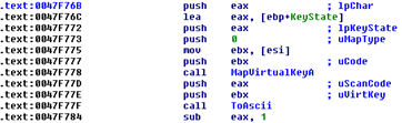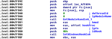 EDX points to the size, shown in the above picture, with the ASCII value of 0x31 that means "1" Kb. But how's keylogging performed? Since no driver has been loaded by the backdoor we have to assume that it does something in userspace, and indeed this is the case, in fact the keylogging thread will simply call SetWindowsHook to receive the keyboard notifications: