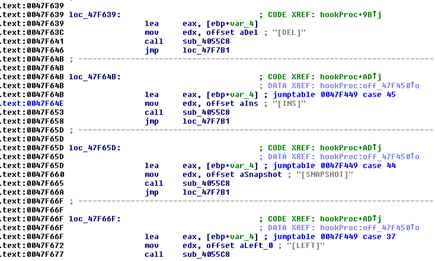 What I marked as hookProc takes care of keyboard data processing, there's a big switch that identifies every single keystroke, including special keys: