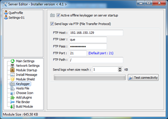 The ftp server is optional and only required if you want to transfer keylog data via ftp. If you like, setup your FTP (just use FileZilla Server if you don't have one already running) and fill the credentials, my password is the same used to encrypt the traffic: quepassword. Decide if you want to change the icon or mess up with the victim's hosts file and go to the Build Module section. We're not using the file binder because it wasn't used in the original attack, anyway should you be curious, what you have to know is that it's a simple packager that starts one file and drop the other in the %tmp% directory, running it at the same time. That's what you would use if you want to bind the backdoor with another legitimate file.