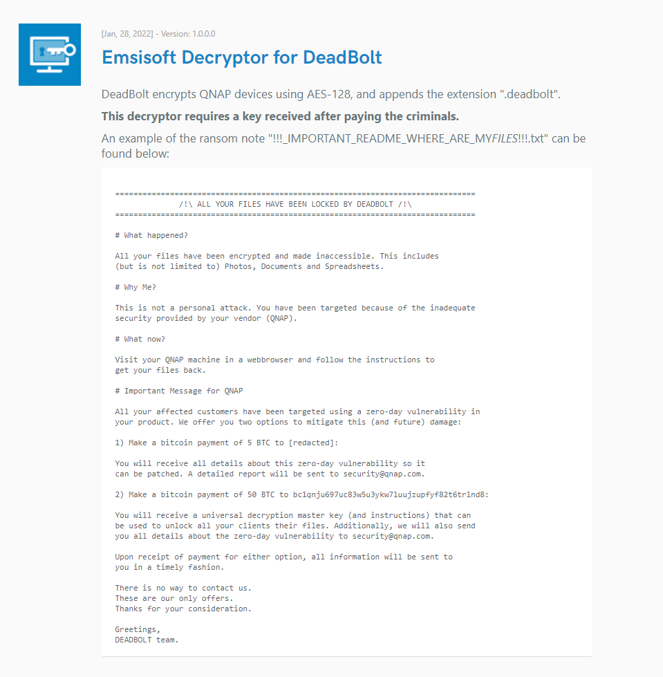 Deadbolt ransomware details