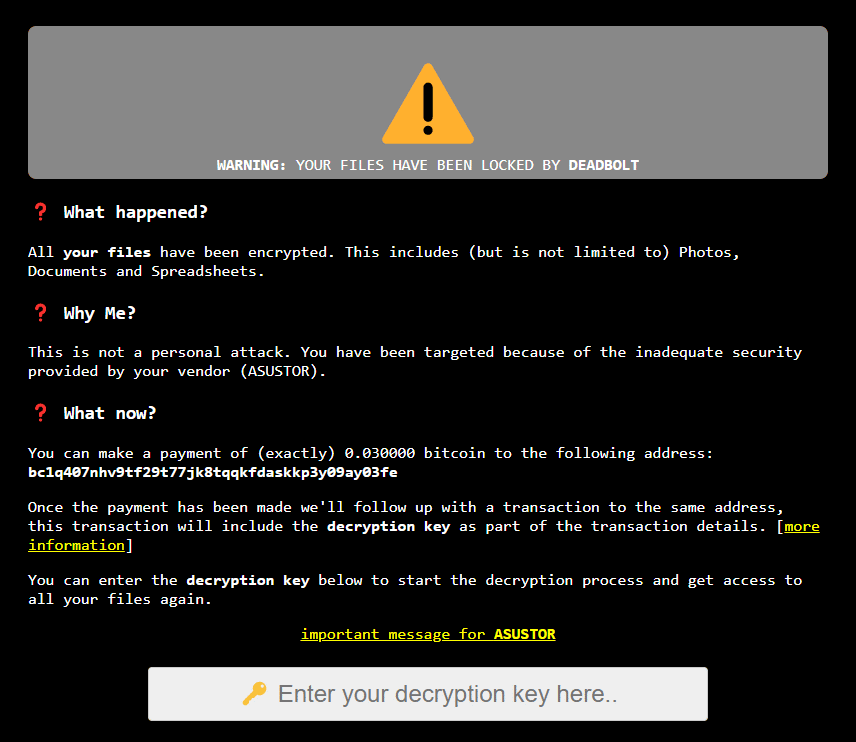 Deadbolt ransomware is on the rise. More recently, this malware has impacted QNAP NAS appliances and ASUSTOR network-attached storage (NAS) devices. One of the most popular threads about these attacks can be found on Reddit, where a ransomware victim explains how to identify damaged devices and defeat this ransomware.