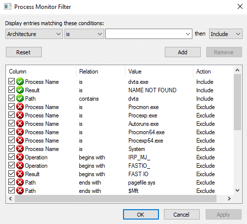 - Launch Process Monitor and apply some filters to filter the output on the main window. We can apply a filter by navigating to the Filter window and choosing the desired options as shown in the figure below.