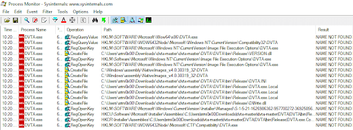 As we can see in the preceding image, we are examining a binary called dvta.exe. We would want to explore all the application events where the result is NAME NOT FOUND. This is to spot if any DLL is searched for and not found.