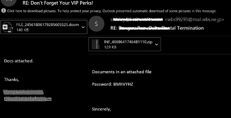 The infection chain starts as usual: phishing emails and social engineering are used to lure the victims. The fake emails contain Word, Excel or zip attachments that deploy the Emotet’s first stage on the victims’ machines, a well-known method primarily used by criminals during the last two decades to increase malware proliferation over the internet.