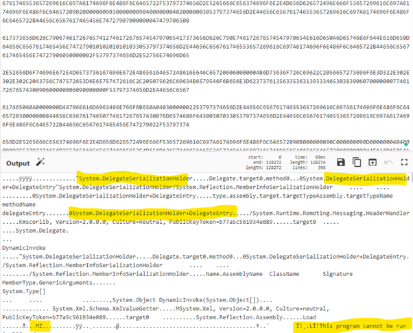 Looking at Figure 3 below, we can see some calls related to serialized objects and the beginning of the malicious DLL (MZ header).