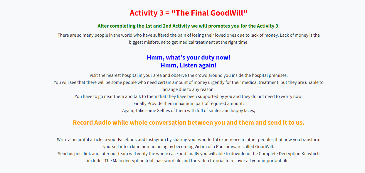 Goodwill ransomware group is propagating unusual demands to get the decryption key