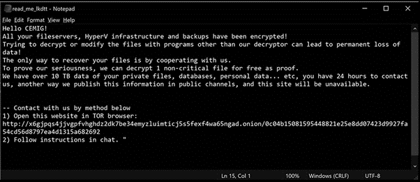 The ransom note is customized, including the volume of compromised and exfiltrated data, and also the name of the target firm. This is a clear indicator that criminals navigate for days through the internal infrastructure, compromising a lot of systems, and finally deploying the ransomware to terminate the kill chain.