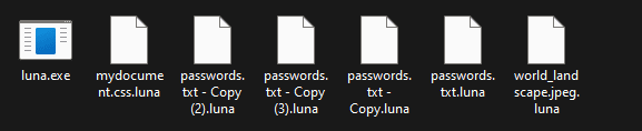 The extension .luna is appended to all encrypted files during the encryption process, but the ransomware capabilities are still under development.