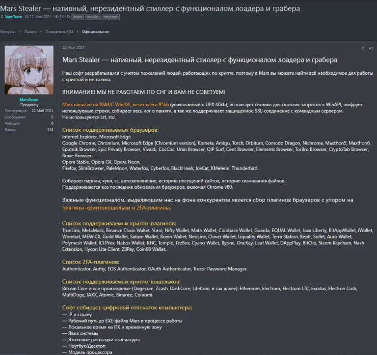 Figure 1: Mars Sstealer announced on an underground forum in 2021 (source).