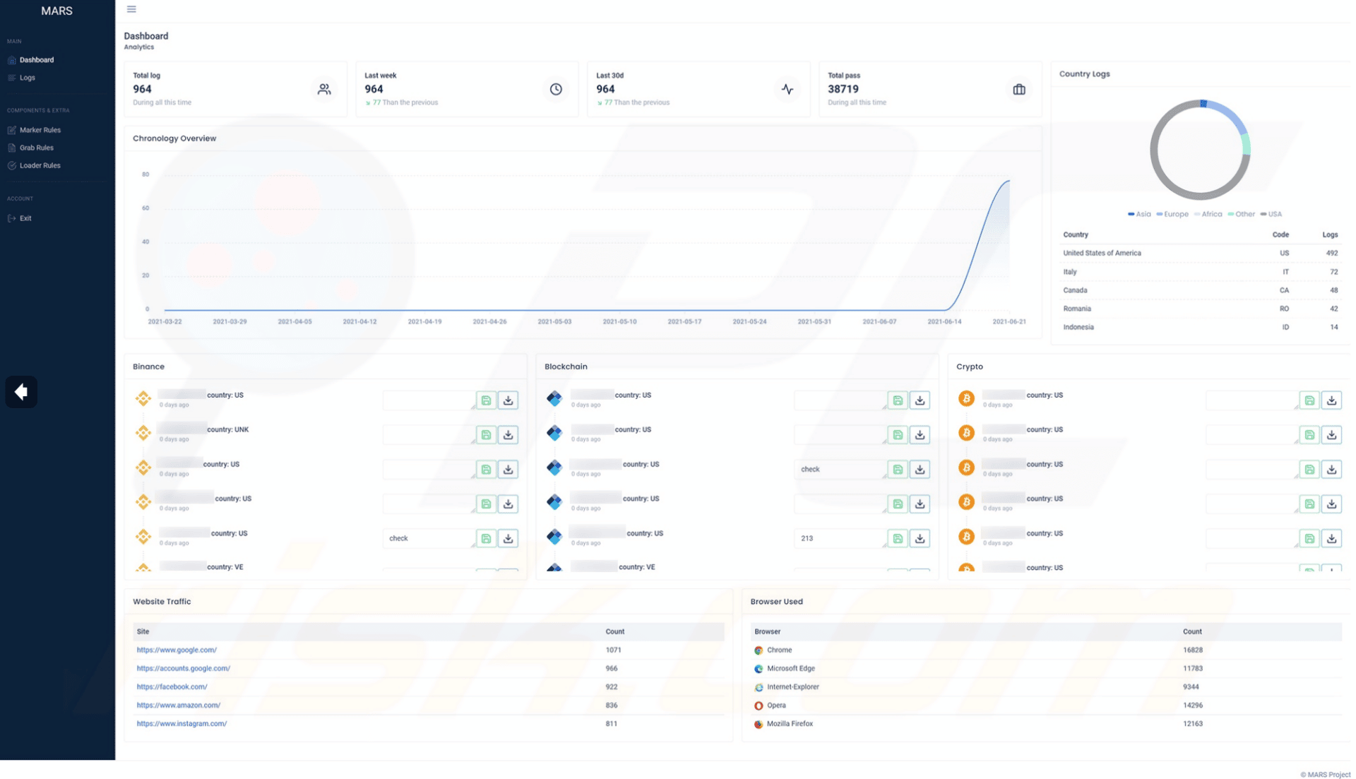 Bitcoin Core and all derivatives (Dogecoin, Zcash, DashCore, LiteCoin, etc), Ethereum, Electrum, Electrum LTC, Exodus, Electron Cash, MultiDoge, JAXX, Atomic, Binance, and Coinomi.Figure 9: Crypto wallets targeted by Mars Stealer (source).
