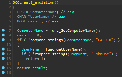 After decrypting the malware strings, some internal procedures became more apparent. This new variant uses anti-analysis techniques, namely anti-debug and emulation procedures.