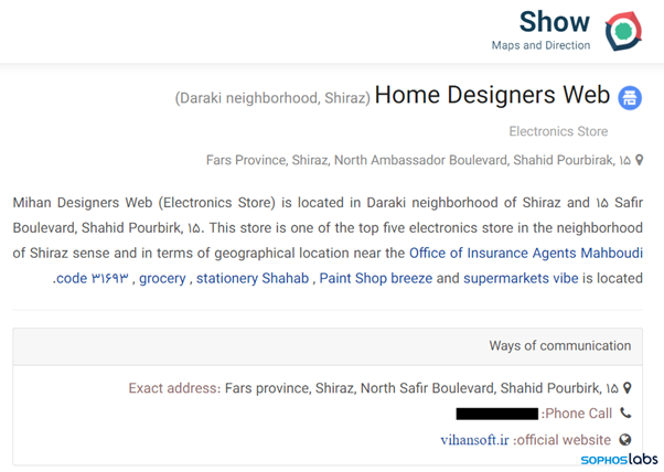 Additionally, Sophos said, “We found a reference to the business behind vihansoft.ir in the Persian-language mapping website neshan.org. Similar to Google Maps or Waze, Neshan includes business information as part of its mapping services, and the entry for a company that lists vihansoft.ir as its website and names its managing director.”