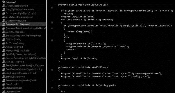 By analyzing the malware source code, we can find a function called “ExtractZipFile” is invoked when the DLL file is retrieved, confirming the file is a zip archive. After that, some settings are fixed and the malware starts the mining activity.