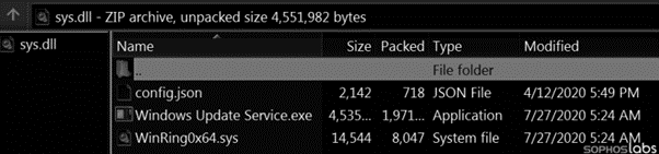 The payload is a file named sys.dll, which, despite its file suffix, is not a Windows DLL. The file is a zip archive containing a crypto-miner PE file (Windows Update Service.exe), its configuration (config.json) and a kernel-level device driver (WinRing0x64.sys).