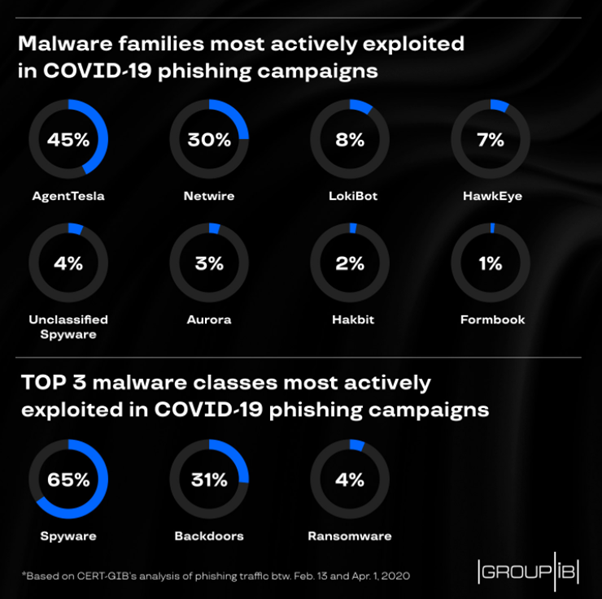 Figure 2: Malware families most actively exploited in COVID-19 phishing campaigns from February to April 2020 (Group-IB)